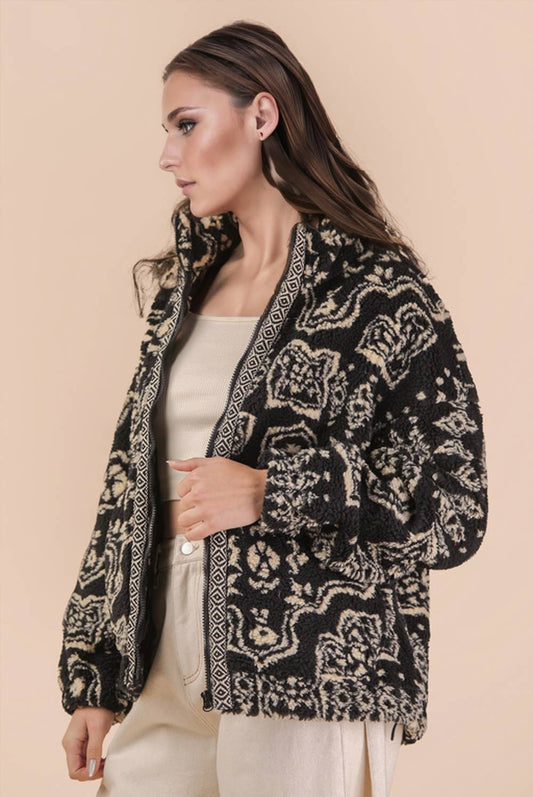 Oversized Trim Detail Printed Casual Fleece Jacket